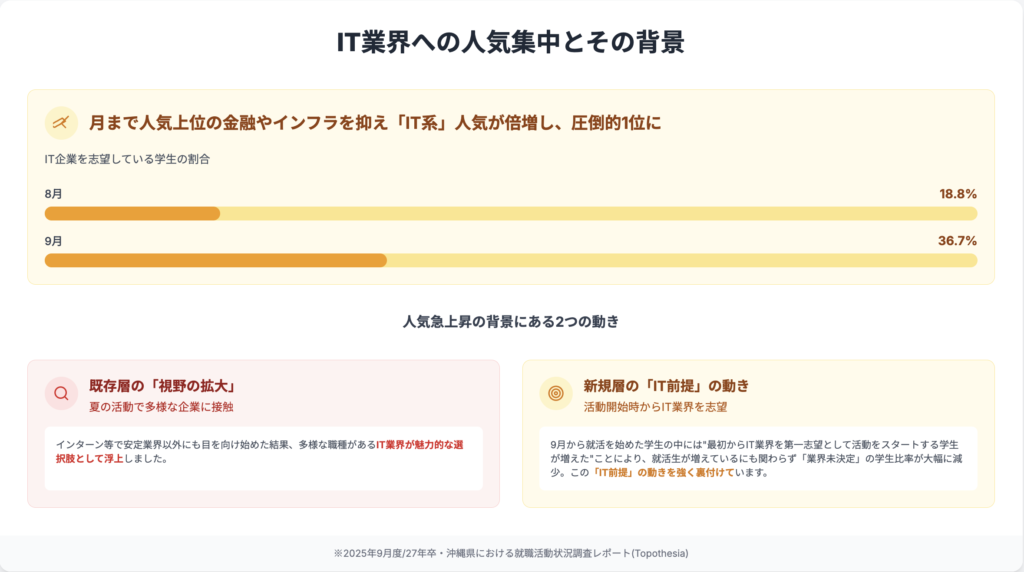 8月までは金融やインフラといった業界が人気でしたが、9月には「IT系」を志望する学生が8月の18.8%から36.7%へと倍増し、1位となりました。