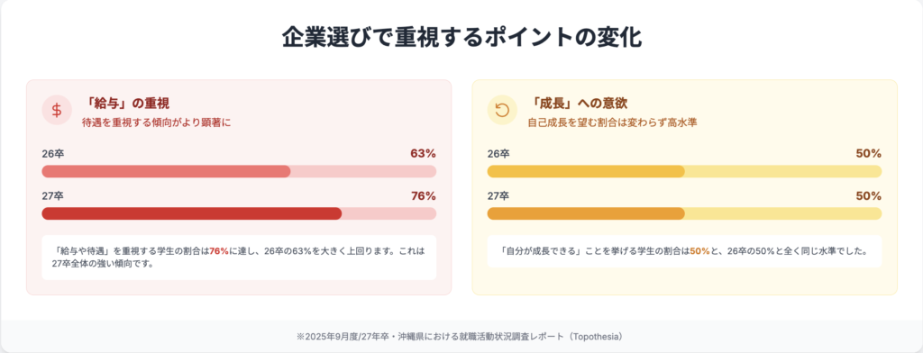 特に「給与や待遇」を重視する割合は、26卒の63%を大きく上回っており、経済的な安定を強く求める傾向が見られます。同時に、自身の市場価値を高められる「成長環境」も、昨年同様に重要な選択基準となっています。